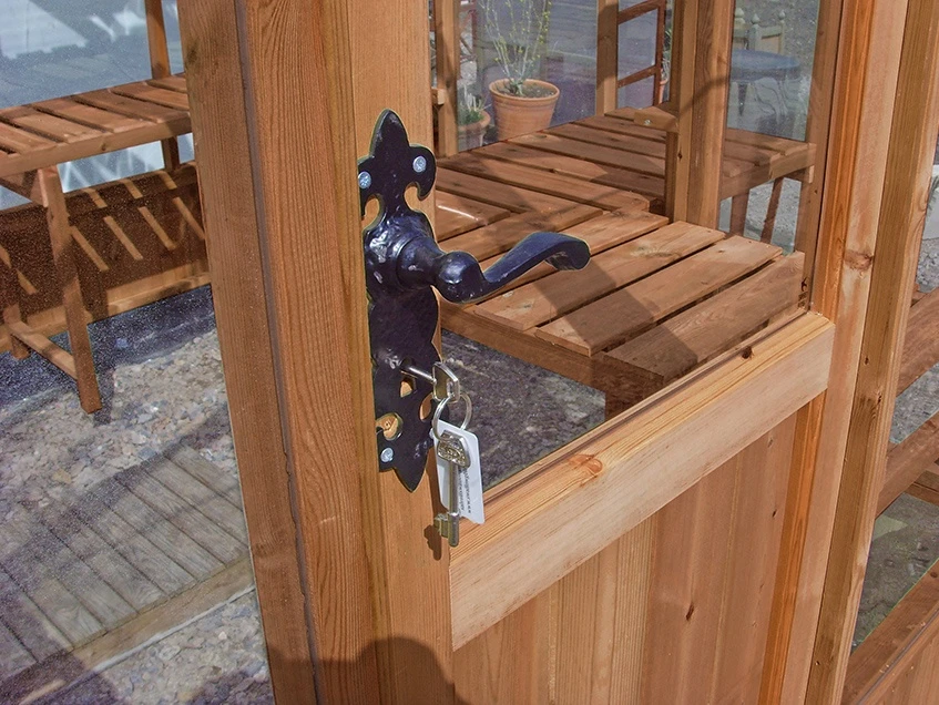 An attractive ornate black door handle is available to add to your order of a shed from Swallow GB.